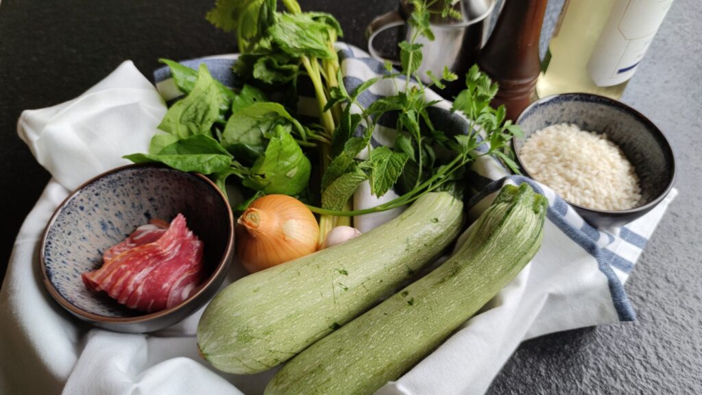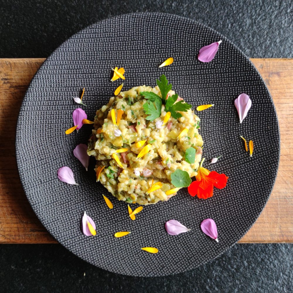 Heerlijk smeuïge risotto met de gerookte kracht van spekjes en welwillende veelzijdige zachtheid van courgette. Citroenzeste en bieslookbloemetjes verfijnen het gerecht.